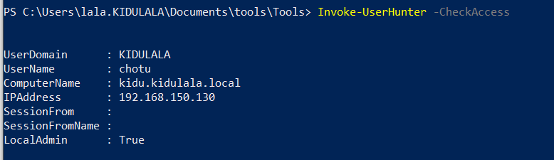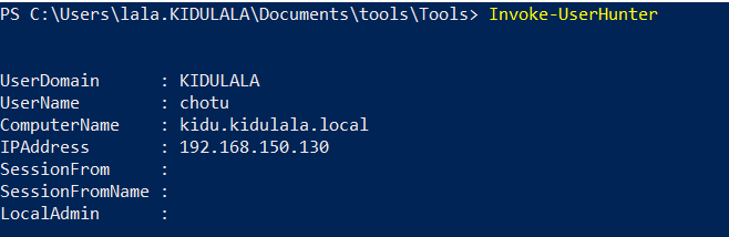 - Now we need to check if there’s any machine where our current user has admin access and a domain session is active. We will use Invoke-Hunter for that. We got the server “kidu.kidulala.local” where the domain admin “chotu“ has a session.