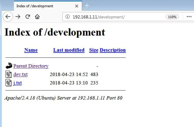 As can be seen in the above screenshot, two directories were identified by the dirb tool on the target machine. Let's open the "development" directory first to see its contents.