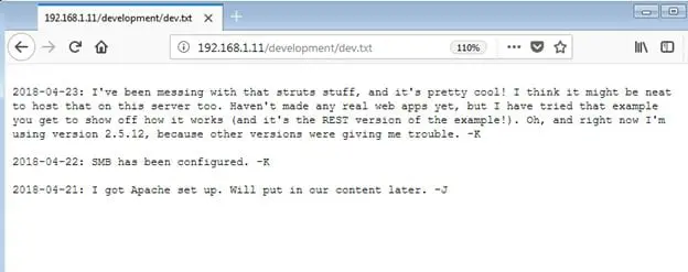 Directory listing was enabled in the "development" directory, which can be seen in the above screenshot. There were two txt files available, too. Let's read the text file.