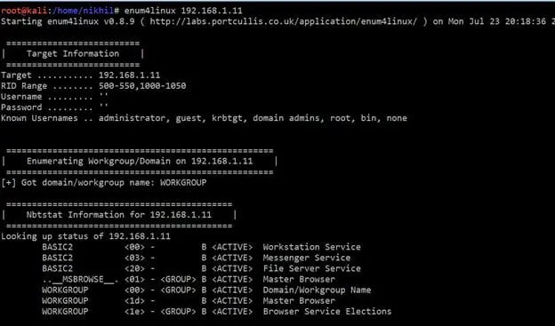 As of now we do not know the username, but we have the SMB port available. So let's start the enumeration for the SMB port. For enumerating SMB I used a utility called "enum4linux," which is by default available in Kali Linux. The enum4linux screenshot can be seen in the following screenshot.