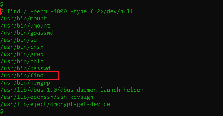 Command used: find / -perm -4000 -type f 2>/dev/null