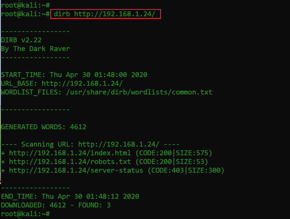 As we can see, it is just a default web page which does not have anything further to do. To get more idea about the target machine, I decided to run a file and folder enumeration tool. I used the dirb utility for this purpose. The results of the scan can be seen in the following screenshot:
