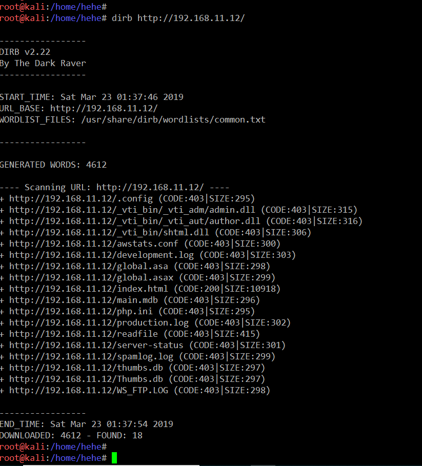 In the above screenshot, we can see that dirb has identified some files on the target machine, but all of them returned 403 response codes. This means that they are forbidden.