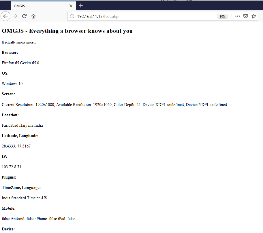 I used Nikto Vulnerability Scanner to find out the weak points on the target application, but it did not provide any interesting information about the target machine. While exploring the target machine manually, I found a file called “test.php” in the target system, which displays some browser information. The output of test.php can be seen in the following screenshot.