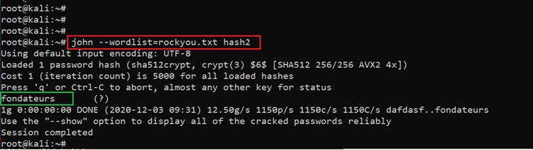 Command used: << john –wordlist=rockyou.txt hash2 >>
