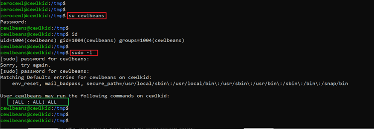 After changing the current user to ‘cewlbeans,’ we ran the ‘sudo –l’ command to find the user level permission. It turns out this user has full permissions over the target machine, highlighted in the above screenshot.