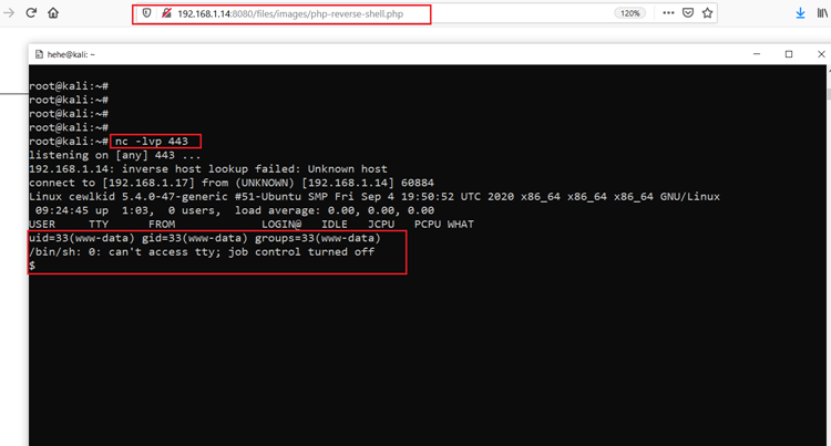 After that, we executed the reverse shell by accessing the file in the browser. We then waited on our attacker machine and successfully captured a reverse connection from the target machine.