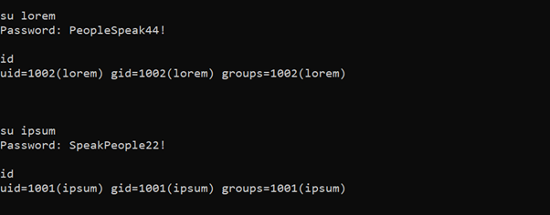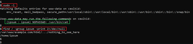 Next, I ran the ‘sudo –l’ command to find out the commands that the current shell can process on the target machine. There was an interesting finding: we were able to view the files in the ‘ipsum’ group by using the ‘usr/bin/cat’ command. This is highlighted in the screenshot above.