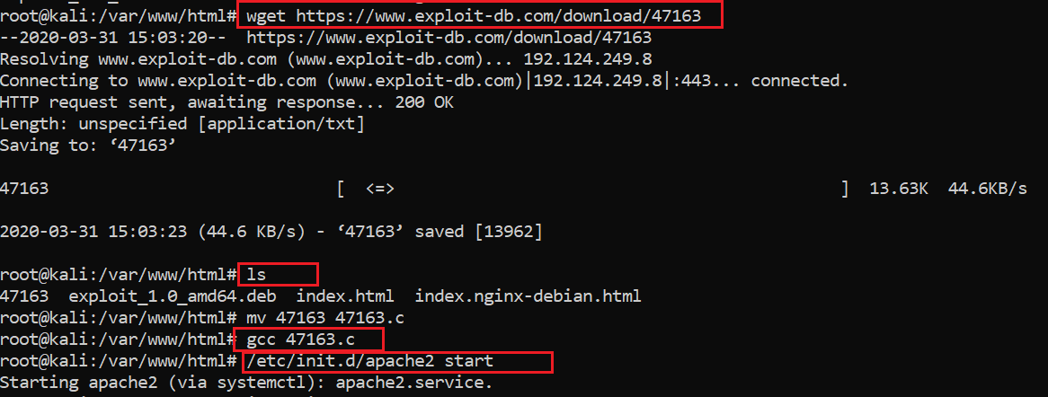 As you can see, first we used the wget utility to download the exploit in the html directory on our system. The name of the downloaded exploit file is “47163.c”. After that, we used the gcc utility to compile the exploit. The command used to compile the exploit is given below: