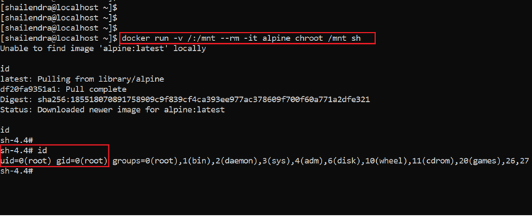 - docker run -v /:/mnt –run -it alpine chroot /mnt sh