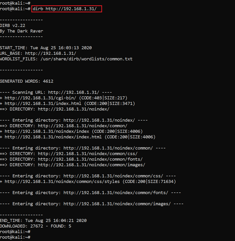 Command used: dirb http://192.168.1.31