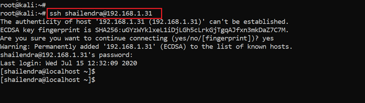 Command used: ssh shailendra@192.168.1.31