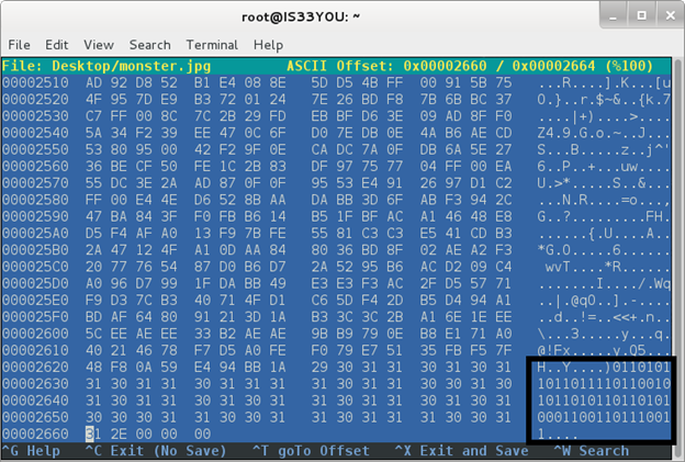 Note: Alternatively, you can open this image file in 'notepad.exe' to view the raw ASCII dump and scroll to the end of the file to locate the binary sequence that stands out [Figure 6].