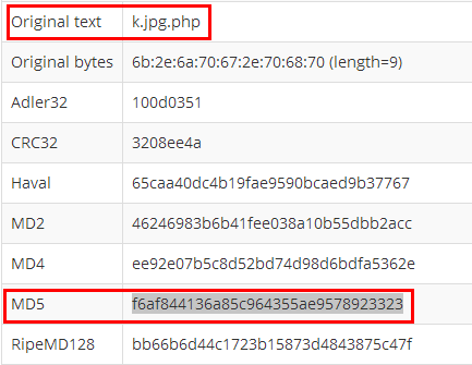 But there is no need to worry. We know where our image is and the current name of the PHP file. We can access our PHP file by changing the file name into a MD5 hash. First, calculate the MD5 for k.jpg.php: