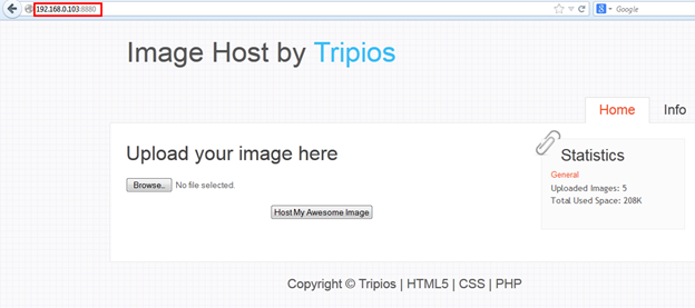 This time we get the Apache server details, such as the server version, installed modules, etc. That is enough for our enumeration phase; we now have much information about our target. Now go back to the application home page and try out the application's functionality to see how it works? We can see that there is a file upload functionality there, so try to upload an image file.