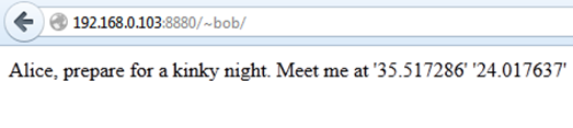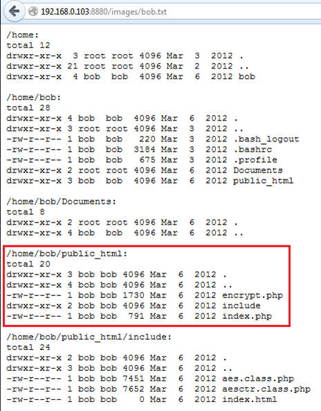 We can see that bob is a user on this server and we can see his all directories. There is a public_html folder, which means he has a web application. We tried to open his application by calling this URL: http://192.168.0.103/~bob/