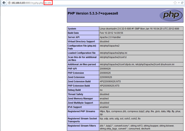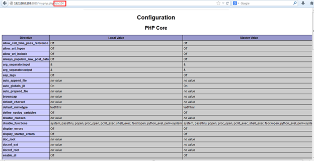 Now this time we have some juicy information; the full PHP configuration is disclosed. We can see all PHP functions that are disabled from configuration file. Again we changed the id value to 108.