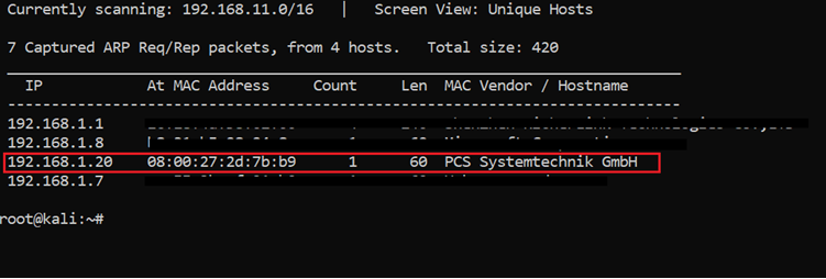 In the above screenshot, it can be seen that we have the IP address of all the devices connected to our router, but due to security reasons, we have hidden the MAC address of my personal connected devices. The Virtual Machine IP address that we will be working on throughout this challenge is 192.168.1.20 (the target machine IP address). We will be using 192.168.1.18 as the attacker IP address.