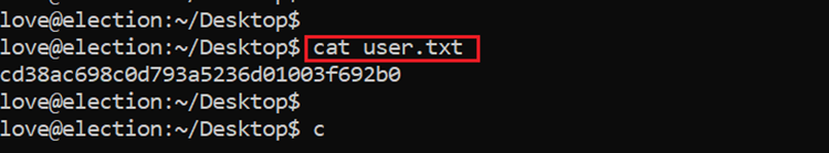 As we can be seen in the above screenshot, we can log into the machine with the identified username and password. While exploring the target machine with Love user, we got the user flag in the Love user desktop, which can be seen below: