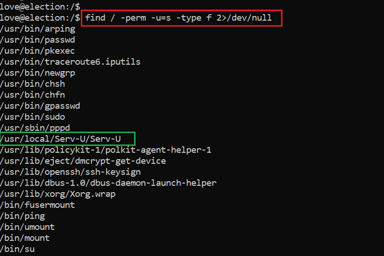Command Used: << find / -prem -u=s -type f 2>/dev/null >>