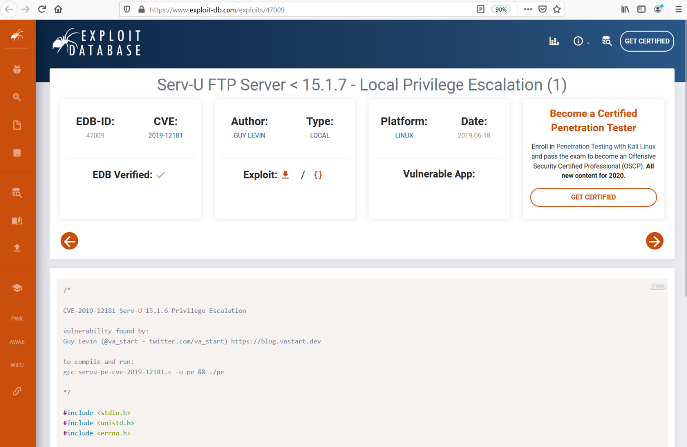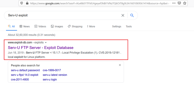 As can be seen in the above screenshot, we ran the find command, which shows the utilities that can be run in user context. While checking these utilities, we find out that Serv-U utility is having the vulnerability of local privilege escalation and the working exploit is available on an exploit db website, as seen below: