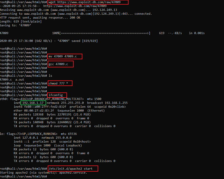 After compiling the exploit, we started the HTTP service in our attacker machine by using the /etc/init.d/apache2 start command.