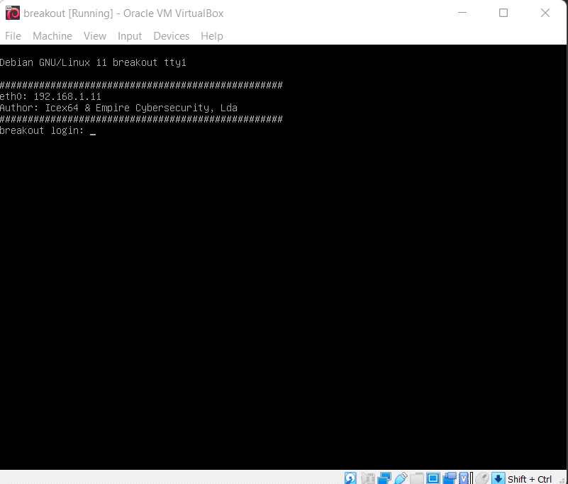 After running the downloaded virtual machine in the virtual box, the machine will automatically be assigned an IP address from the network DHCP. It will be visible on the login screen. The target machine's IP address can be seen in the following screenshot. [CLICK IMAGES TO ENLARGE]