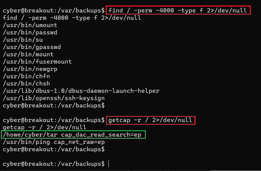 The green highlight area shows cap_dac_read_search allows reading any files, which means we can use this utility to read any files. First, we tried to read the shadow file that stores all users' passwords. Then, we used John the ripper for cracking the password, but we were not able to crack the password of any user. Then we again spent some time on enumeration and identified a password file in the backup folder as follows: