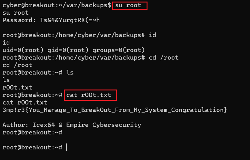 We used the su command to switch the current user to root and provided the identified password. The login was successful as we confirmed the current user by running the 'id' command. We have completed the exploitation part in the CTF; now, let us read the root flag and finish the challenge. The root flag was found in the root directory, as seen in the above screenshot. This completes the challenge! I hope you enjoyed solving this refreshing CTF exercise.