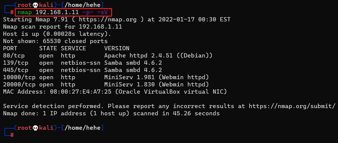 Command used: << nmap 192.168.1.11 -p- -sV >>