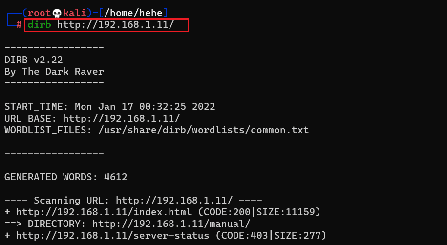 Command used: Dirb http://192.168.1.11