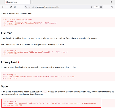 In the last step, we found a utility ‘pip’ owned by the root user and can be executed by the user Arsene. We did some research to understand the utility and its usage. We found a binary that can help us escalate user privilege to the user who owns it. The code for the same was also given, highlighted in the following screenshot.