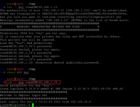 As seen in the above screenshot, first, we tried to log in with SSH, which gives an error of “Unprotected Private Key.” It also suggests changing the file permission to 644 or any lower permission. So, we used the chmod command to change the permission to 600. Then we used the SSH command again, which asks for the passphrase. Since we already have the passphrase, we used P@55w0rd! as the password to log in to the target machine.