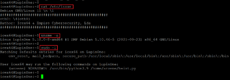 After that, we used the ‘sudo –l’ command to check the sudo permissions for the current user ‘iecx64’. We identified a python script owned by another user, ‘Arsene’, that the current user can run. So, let us check the contents of the python script, which can be seen in the screenshot given below.