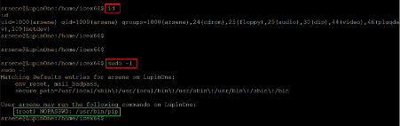 We confirmed the current user by running the id command and found that the current user is Arsene. We checked the sudo permissions for this user by running the ‘sudo –l’ command and found that the pip utility can be run as root. We will exploit the pip utility to gain root access in the next step.