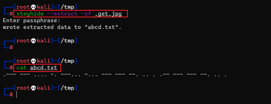 Command used: << stegcracker .get.jpg /usr/share/wordlists/rockyou.txt >>