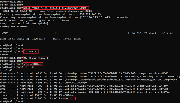 The first result shows a local exploit. We open the exploit DB URL and got to know that the exploit is written in C and it needs to be complied with before executing it. We tried to download the exploit on the attacker machine, but the interesting part was wget utility was not available on the target machine. So, we download the exploit on the attacker machine and complied it with the help of the gcc compiler which can be seen in the following screenshot.