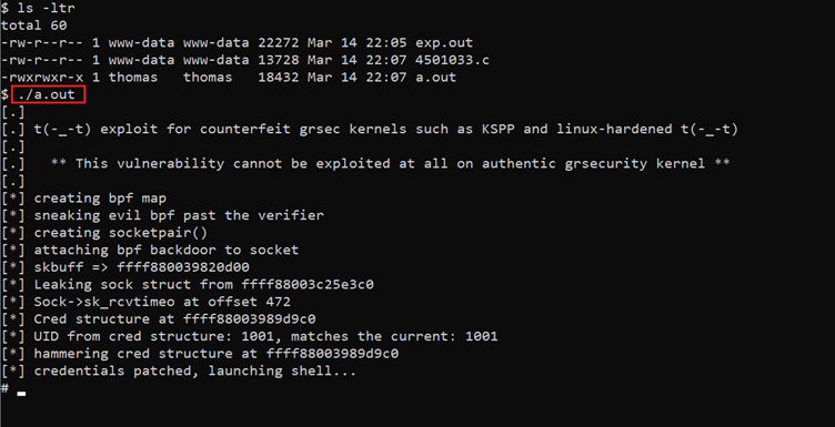 We have the www-data user access on the target machine. However, the target was to get the root access and read the flag file. To do this, we ran commands to identify the operating system and kernel version which can be seen in the below screenshot.