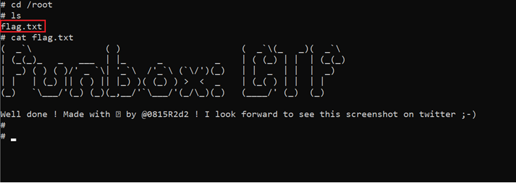 Now we have the root access, so let's read the flag file which should be available in the root folder and can be seen in the below screenshot.