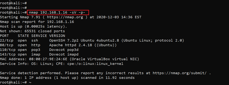 Command used: << nmap 192.168.1.16 -sV -p- >>