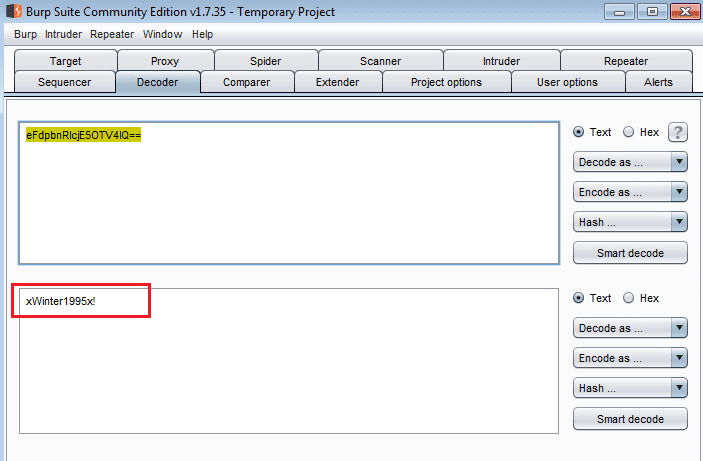 Let’s decode this string using Burp Decoder.