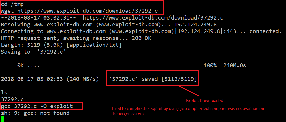 In the above screenshot, we can see that the exploit has been downloaded as “37292.c” on the target machine. Then I used the GCC compiler to compile this exploit on the target machine, but unfortunately the GCC compiler was not available on the target machine. (See above.) So instead, I decided to use the CC compiler to compile the code on the target machine. It can be seen in the following screenshot.